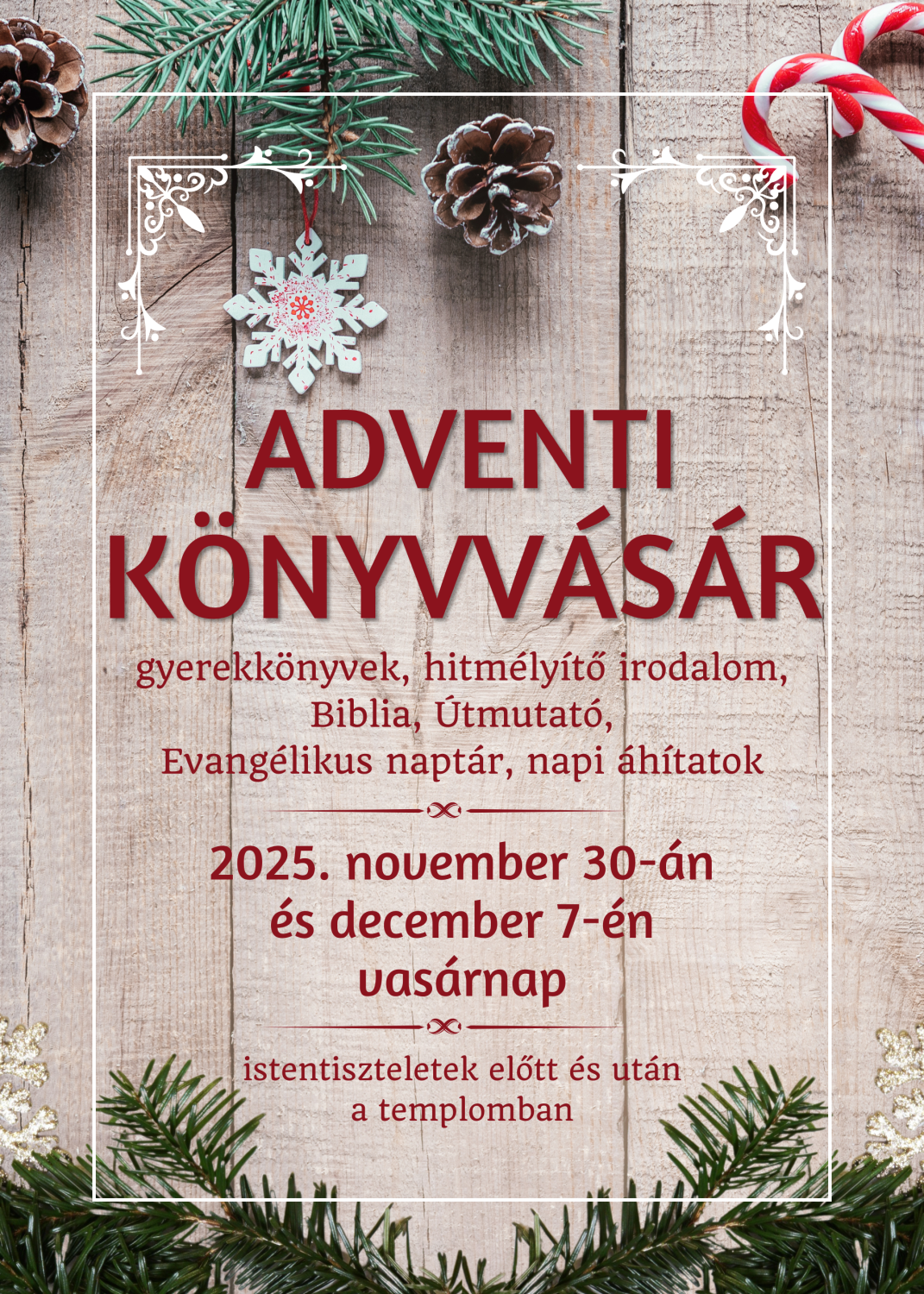 Könyvvásárt tartunk templomunkban 2025. november 30-án és december 7-én, advent 1. és 2. vasárnapján délelőtt.