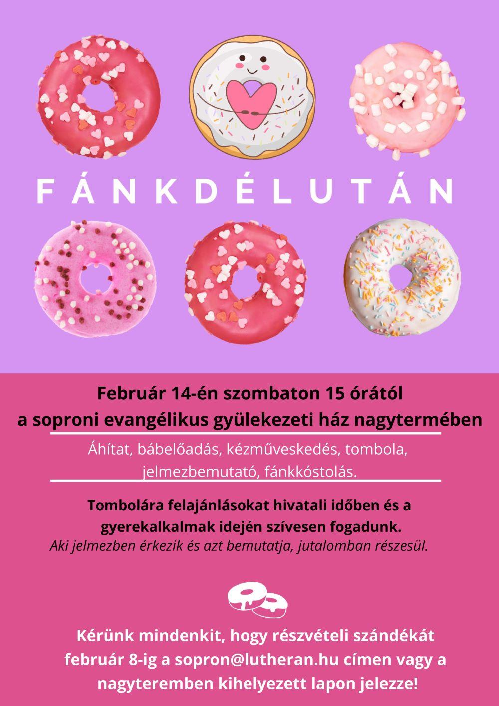 Február 14-én, szombaton 15 órakor farsangi fánkdélutánt tartunk gyülekezeti házunk nagytermében áhítattal, bábelőadással, kézműveskedéssel, tombolával, jelmezbemutatóval és fánkkóstolással. Várjuk a családok jelentkezését és a tombolafelajánlásokat február 8-áig.