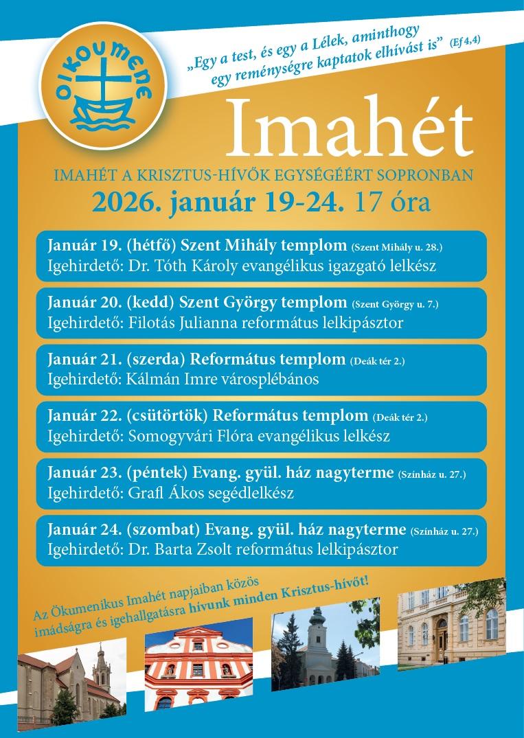 2026-ban január 19. hétfő és 24. szombat között tartjuk az imahetet a keresztények egységéért. Az ökumenikus istentiszteletek hat napon át 17 órakor kezdődnek: