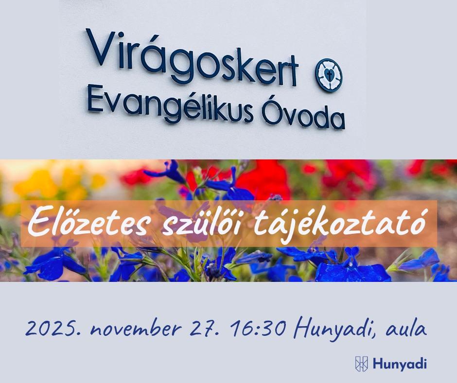 Várjuk az érdeklődő szülőket 2025. november 27-én, csütörtökön 16:30-kor a Hunyadi evangélikus iskola aulájában tartandó előzetes tájékoztatóra! Ismerjék meg a 2026 augusztusában nyíló Virágoskert Evangélikus Óvoda küldetését, nevelési elveit és célkitűzéseit!