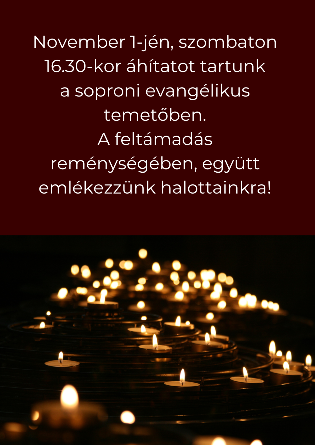 2025. november 1-jén, szombaton áhítatokat tartunk: 15 órakor a balfi temetőben, 16.30-kor a soproni evangélikus temetőben. A feltámadás reménységében, együtt emlékezzünk elhunyt szeretteinkre!
